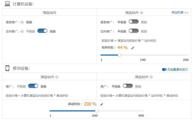 在直通车的投放平台里面,分为计算机端和移动设备端,以及站内和站外推广,在这几个流量入口里面,因为现在大部分类目的主流渠道都在手机端上面,计算机端的流量占比不大,所以我们在设置的时候可以把移动折扣比例调高一点,比如设置到200%,或300%,后面通过PC端的出价调整就可以同步调整到移动端。