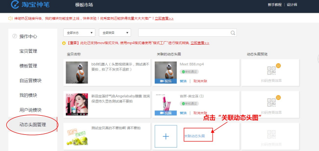 (2)进入动态头图管理后,挑选要编辑的宝贝,点击“关联动态头图”