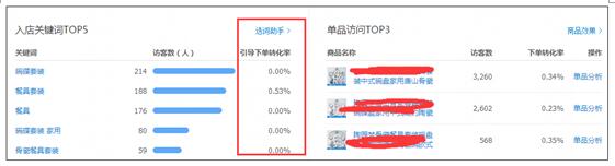 你像这个店铺,我现在看到的是最近30天的PC端的数据,排名前五的进店关键词,除了第二个“餐具套装”有0.53%的下单转化率以外,另外的四个关键词的下单转化率都是0,这至少说明对于PC端来讲,进店关键词是非常不精准的。